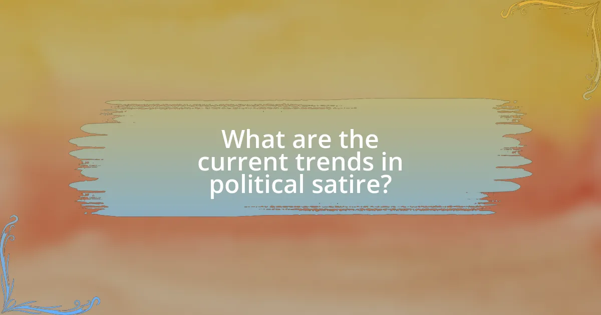 Current trends in political satire include the rise of digital platforms, the use of social media for rapid dissemination, and a focus on real-time commentary on political events. Digital platforms like YouTube and TikTok have become popular venues for satirical content, allowing creators to reach wider audiences quickly. Social media enables satirists to respond to political developments almost instantaneously, enhancing engagement and relevance. Additionally, there is an increasing trend towards intersectionality in satire, addressing issues such as race, gender, and climate change alongside traditional political topics, reflecting a broader societal discourse. This evolution is supported by studies indicating that audiences are more engaged with satirical content that resonates with their lived experiences and current societal issues.